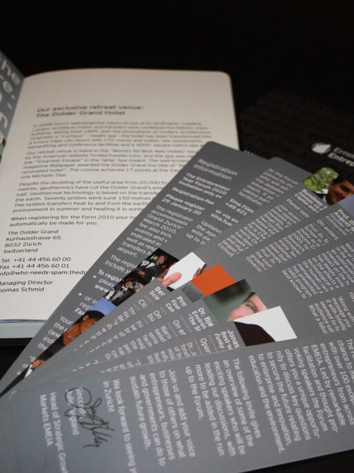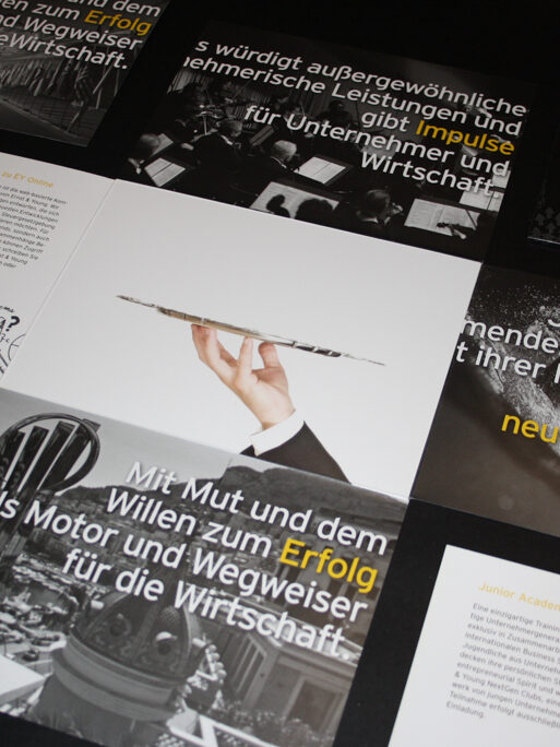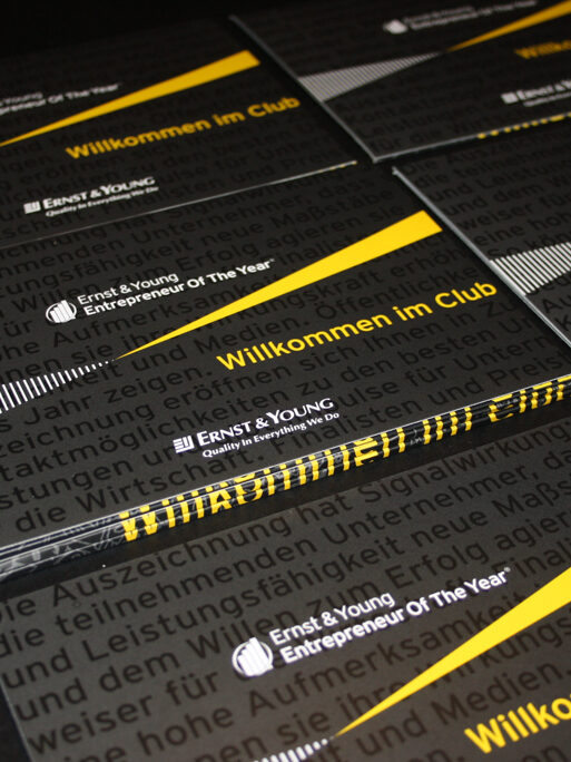 Edle Optik durch Schmuckfarben, Mattlackierung und eine besondere Falttechnik machten die Einladung des Unternehmens Ernst&Young zum „Entrepreneur Of The Year“ zu einem hochwertigen und absolut innovativen Eyecatcher. Als praktisches Add-on enthielt die Klappkarte ein Plastikkärtchen mit den wichtigsten Informationen zur Veranstaltung. Auftragsarbeit für die Agentur marbet.